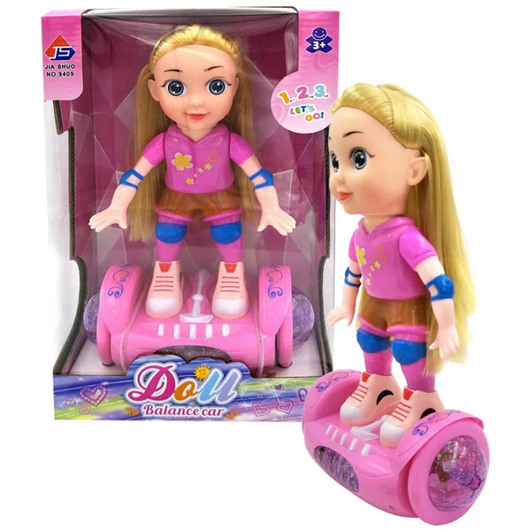 Watch your child’s delight as this adorable doll glides on her balance car, spinning to cheerful tunes and sparkling LED lights for enchanting playtime.